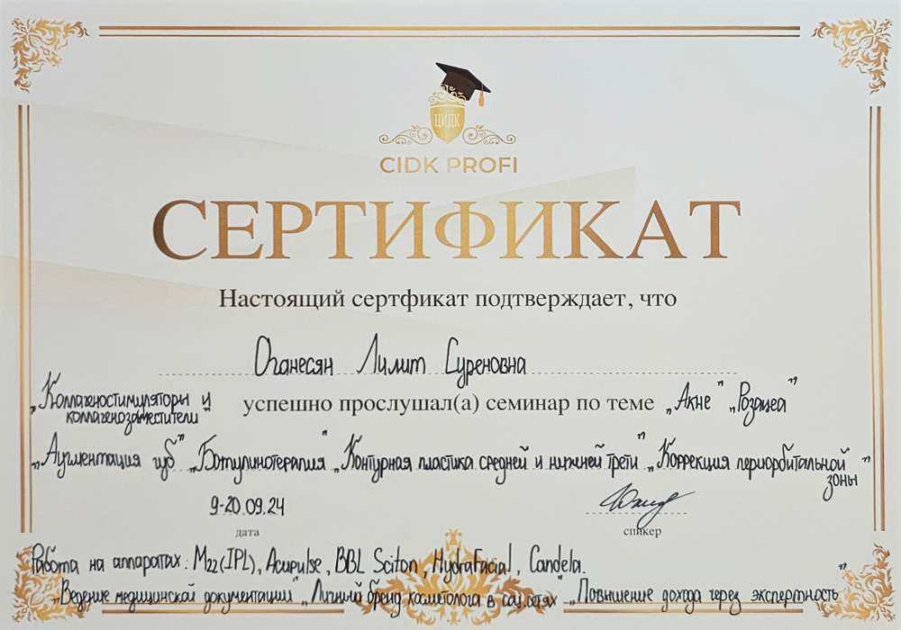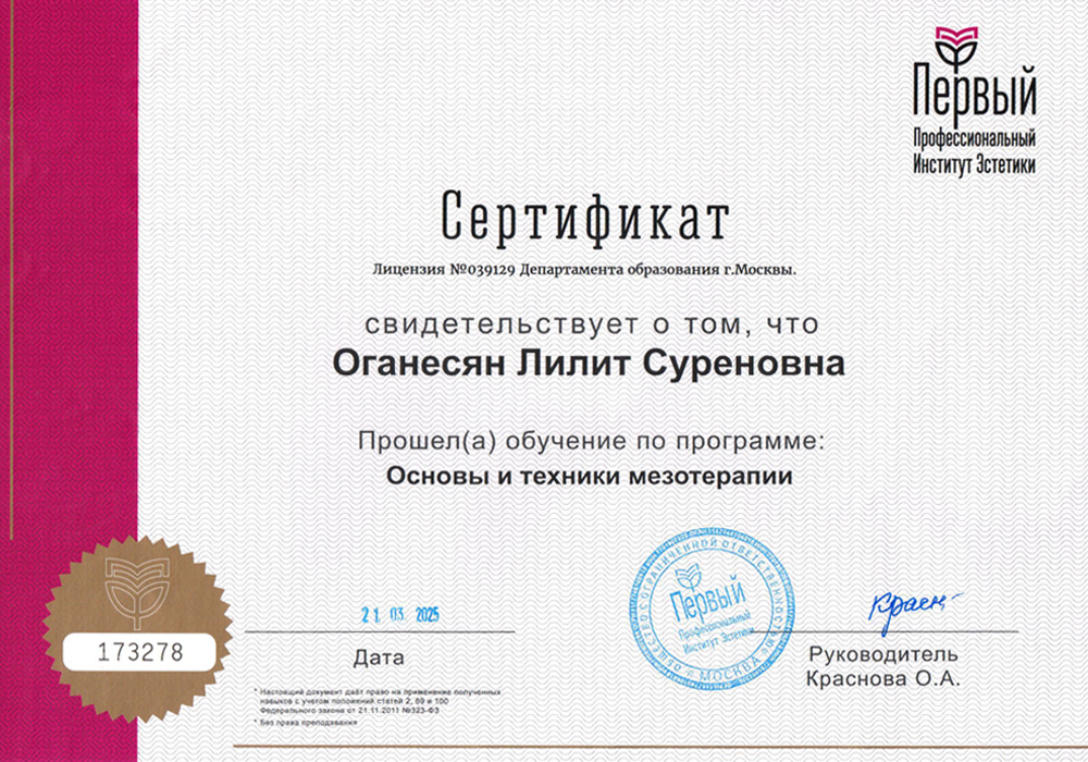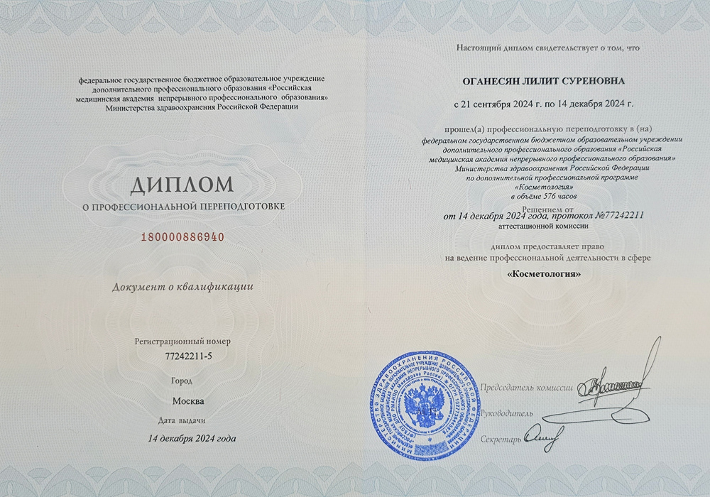 В 2025 году прошла аккредитацию по специальности «Косметология».