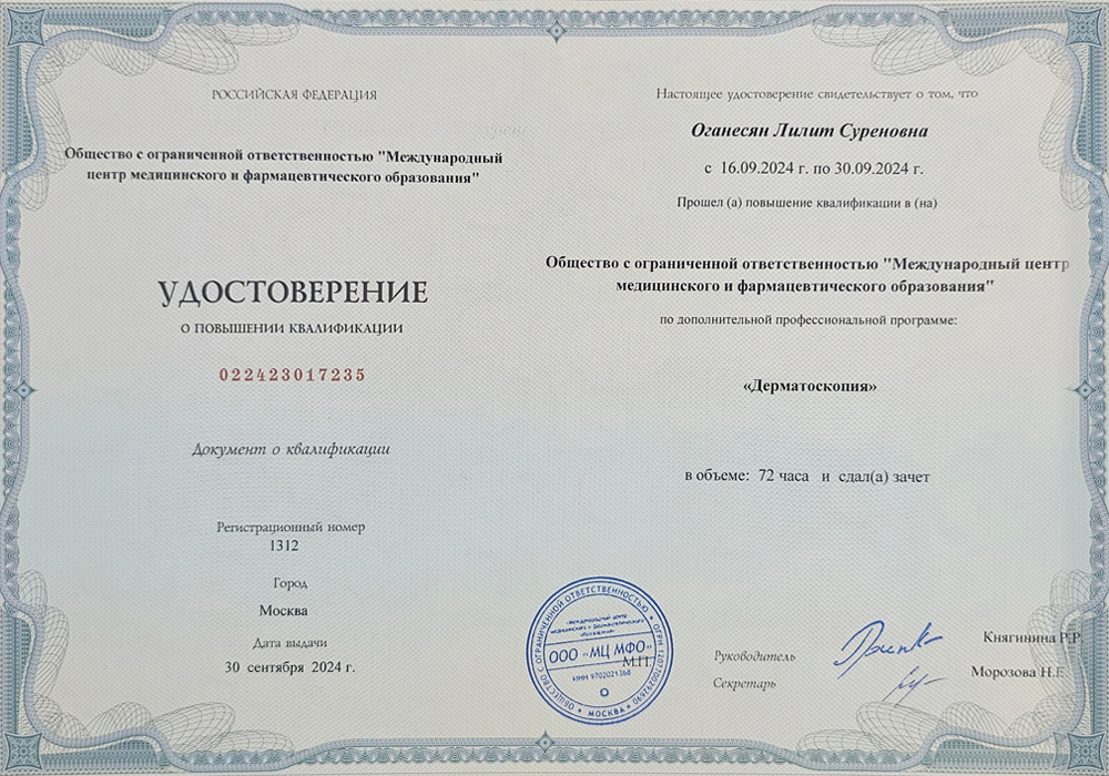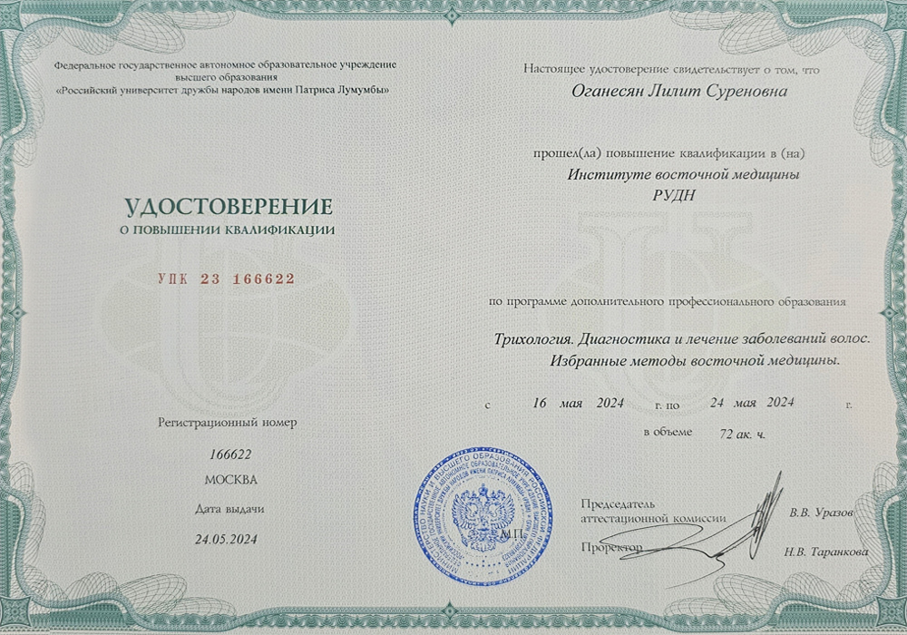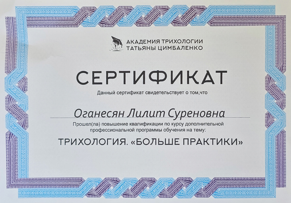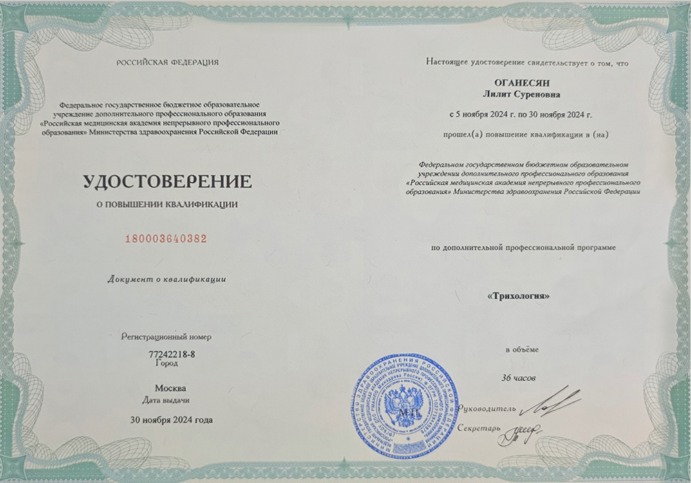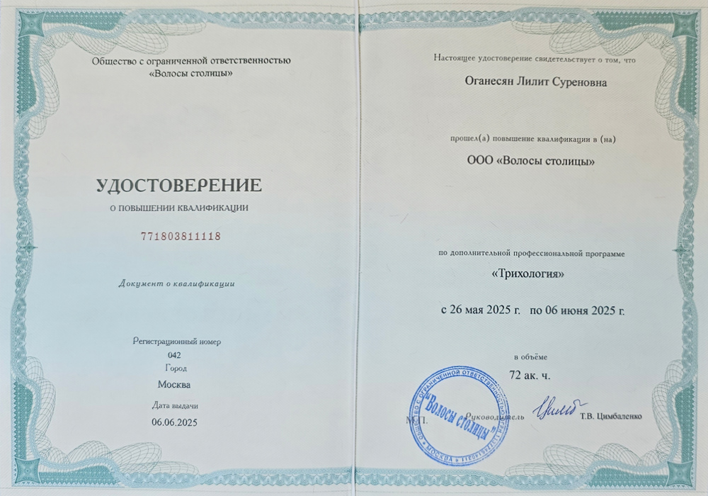 В 2025–2026 годах прошла повышение квалификации по специальности «Трихология» (575 академических часов).