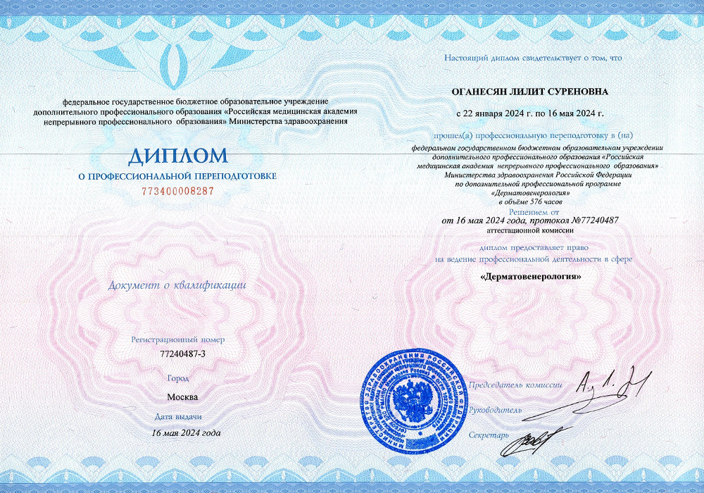 В 2025 году прошла аккредитацию по специальности «Дерматовенерология».
